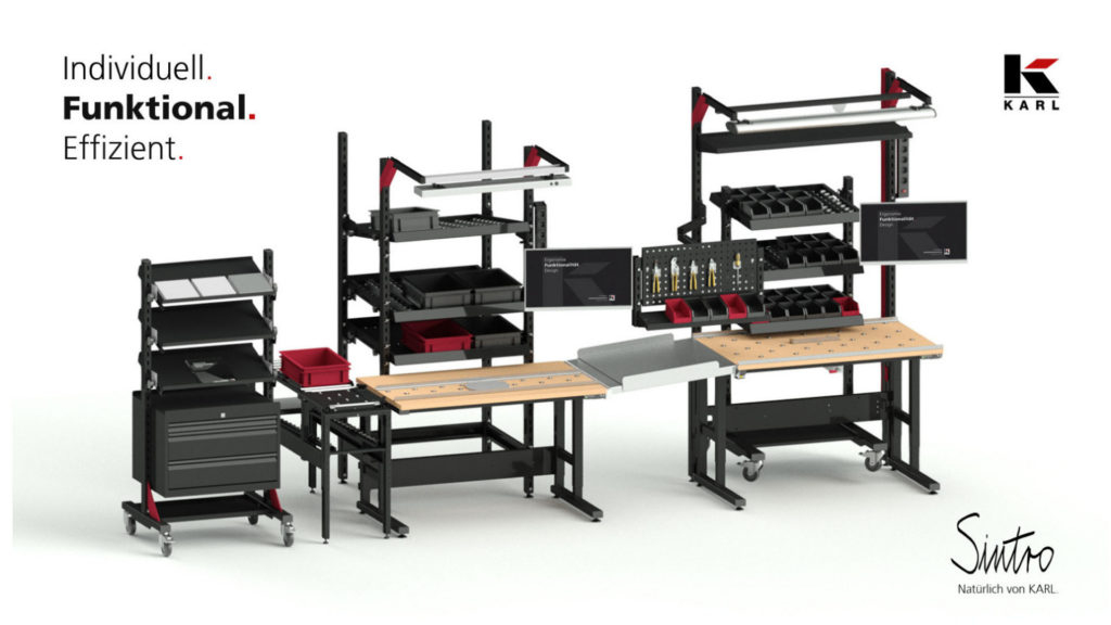 Für jede Produktionsstrategie bietet SINTRO ein umfangreiches Programm zur verschwendungsarmen Gestaltung von Montageprozessen, Materialfluss und Kommissionierung. SINTRO macht nahezu alles mit und präsentiert sich auch nach langer Zeit und intensiver Nutzung wie am ersten Tag, denn bei KARL legen wir größten Wert auf materialgerechte Konstruktion und hochwertige Verarbeitung.