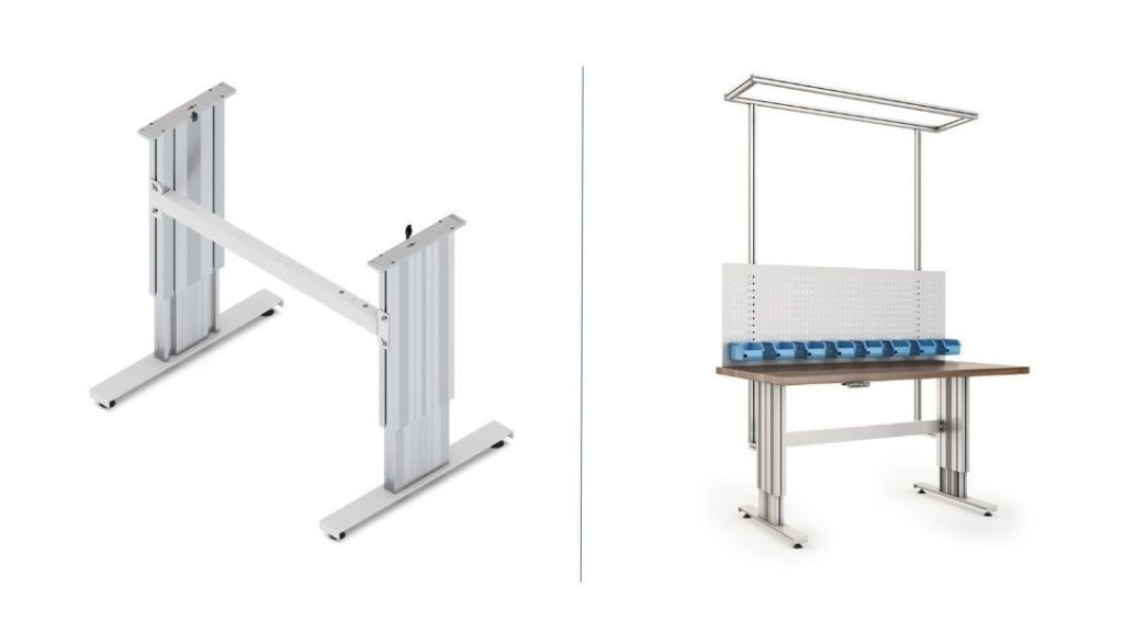 An drei Seiten befinden sich Montagenuten (Breite 8 mm), die auf der gesamten Länge der elektrischen Hubsäule den Anbau von Traversen, Zwischenablagen, An- und Aufbauten ermöglichen. So können mit der Spindelhubsäule SL auch komplette Tischuntergestelle realisiert werden.