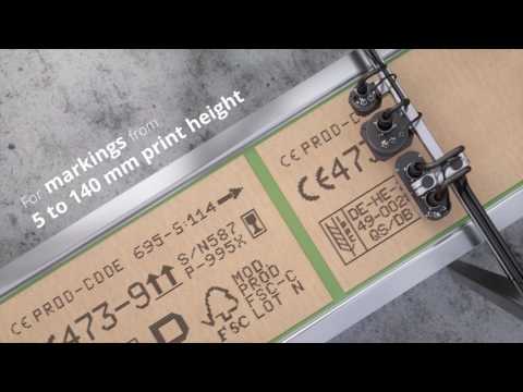 The modular coding and marking systems for texts, dates or logos are available in printing heights up to 140 mm for each print head. The resolution meets the requirements of virtually all industrial applications for marking and coding.